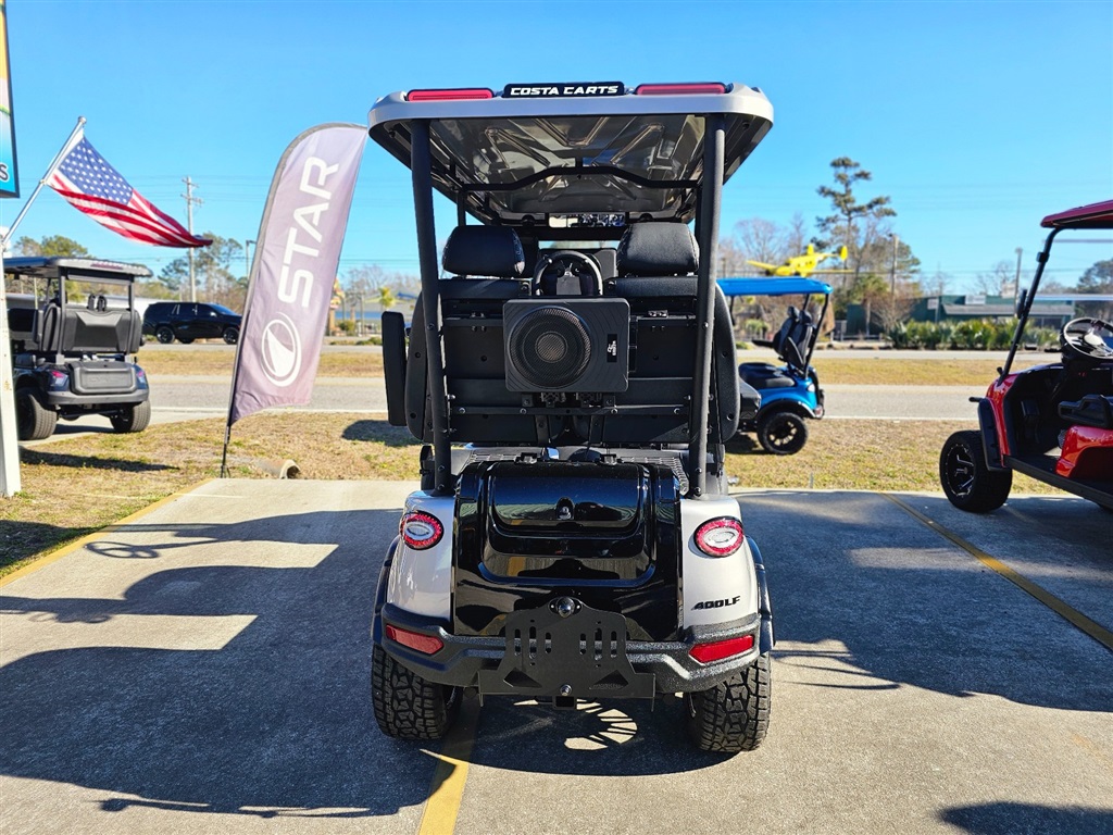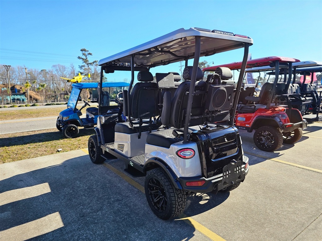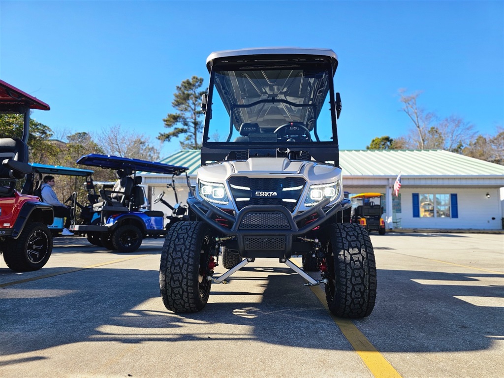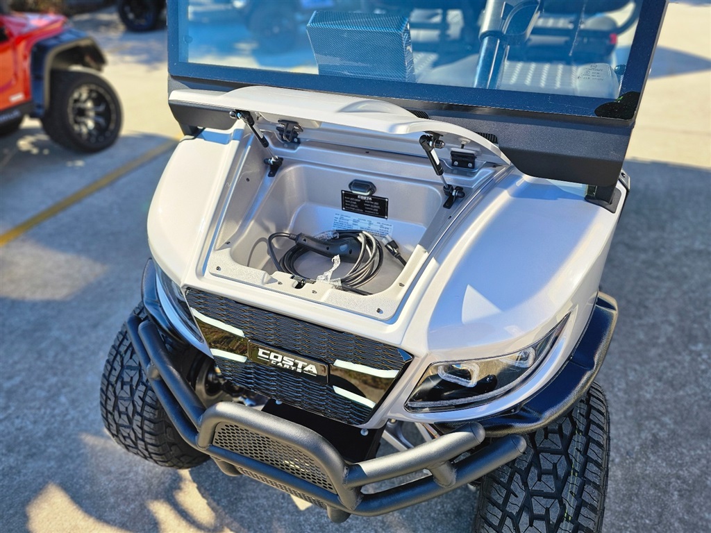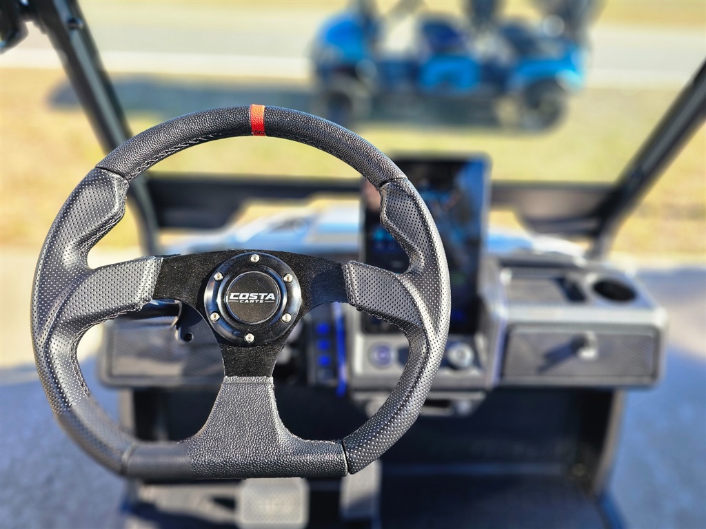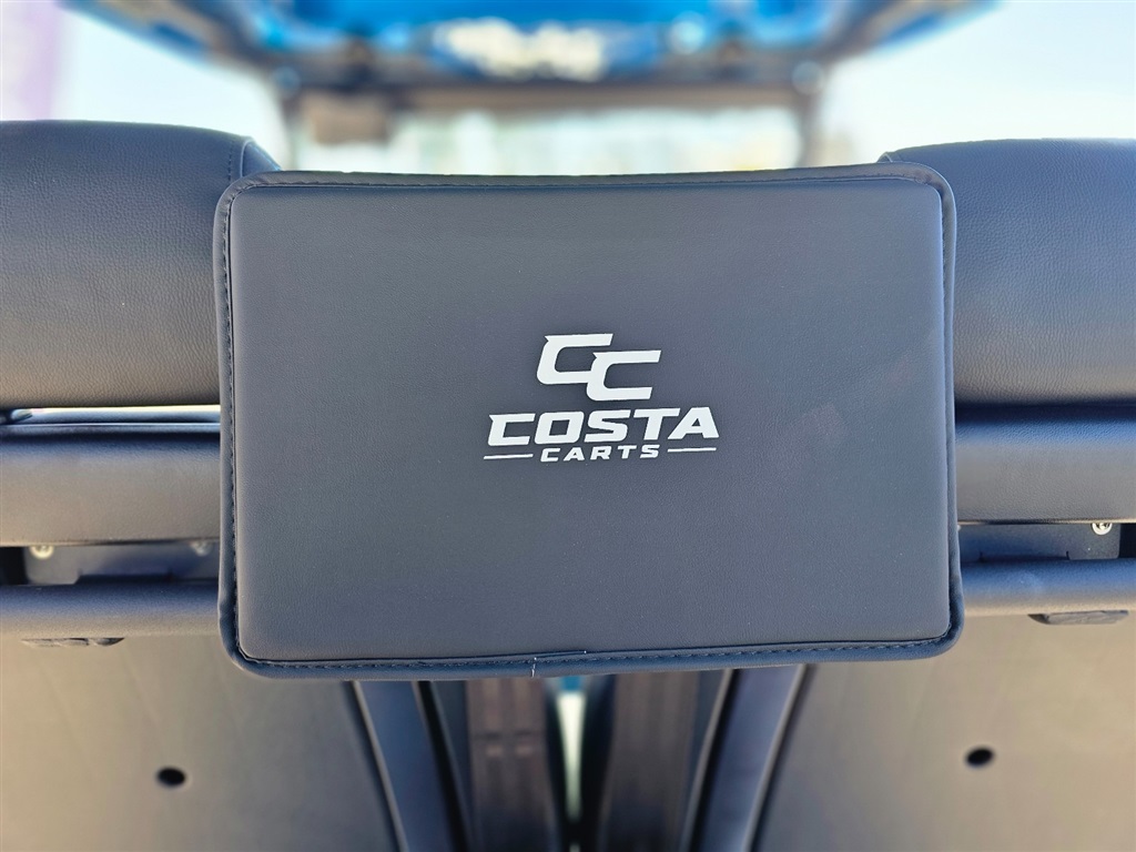 2026 Costa Carts Upgrades and Additions. ? Adjustable Armrests on Seat Backs ? Adjustable and Telescopic Steering Column ? Roof Mounted Interior Courtesy Lighting ? Lights in Glove Boxes ? Gas Struts underneath Seat Bottoms ? Electronic Power Steering ? Temperature Adjustable Fan on the Motor Controller ? Adjustable Rear Shocks to match the Front ? Active Balancer in Battery ? Waterproof LED Lit Push to Start Button ? App Controlled LED Speaker Ring Lights ? 650W 12v Reducer, 200W of Additional Power ? Updated B-Pillar Roof Support ? New Control Arm Ball Joints INTERIOR. 13 Vertical In-Dash Display Screen Wireless Apple CarPlay / Android Auto High Resolution Backup Camera High-Quality 6-Speaker Amplified Audio System, with 10 Subwoofer Roof Mounted 3 Tweeters and Low Mounted 6.5 Mids Subwoofer Mounted Behind Backseat Push to Start w/Key Fob Key Fob with Lock, Unlock and Remote Starting Features Carbon Fiber Dashboard In-Dash Locking Compartments USB and USB-C Ports High and Low Speed Switch (15mph / 25mph) Rubber Cup Holder Insert for Dashboard Cupholders Marine High Back Seats w/Adjustable Headrest USB and USB-C Ports for Rear Seats 650W 12v Power Inverter 2nd Row Aluminum Cup Holder 13 Android 11 Rear Display Screen featuring Bluetooth and Wi-Fi Connectivity Painted inside of all body panels Extended Leg Room (1st row 14 Cowl to Pedal) (2nd Row 16.25 Cowl to Cowl) CHASSIS. Black Powder-Coated All-Aluminum Chassis 4-Wheel Independent Suspension Lifted 2.5 Adjustable Front Coil Over Struts Adjustable Forged Aluminum Control Arms 4-Wheel Hydraulic Disc Brakes 120 mm Travel Rack and Pinion for better turning radius Aluminum Battery Tray Aluminum Under Body Skid Plate 1.25 (30mm) Oversized Aluminum Upright Roof Supports B-Pillar for Additional Roof Support and Front Seat Support Automatic Parking Brake Rear Traction Bar with Crossmember Rear Sway Bar EXTERIOR. LED Lighting LED Headlights LED Tail Lights Side Mirrors w/ Turn Signals All Sequential Tu