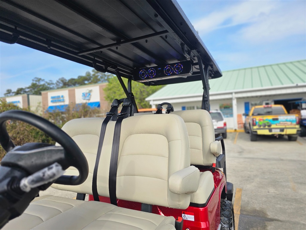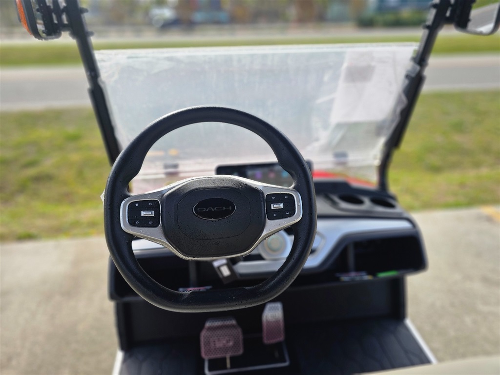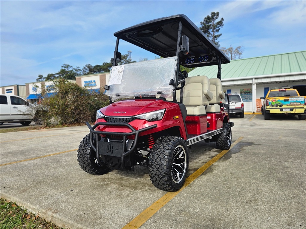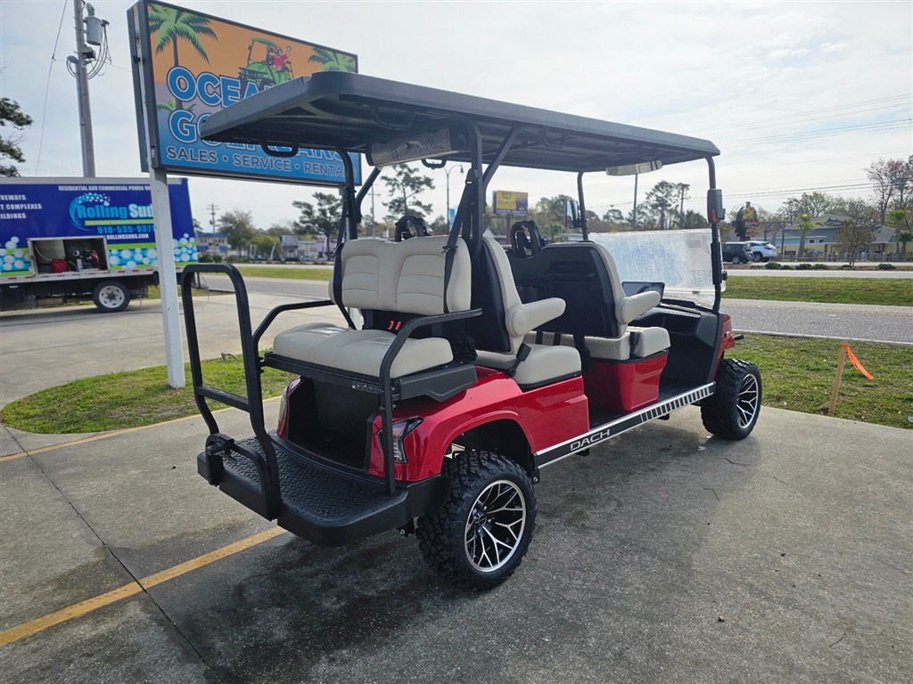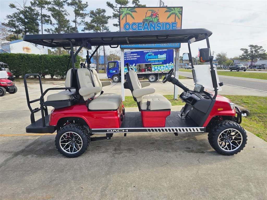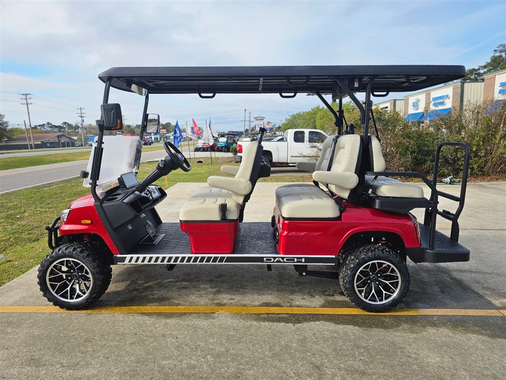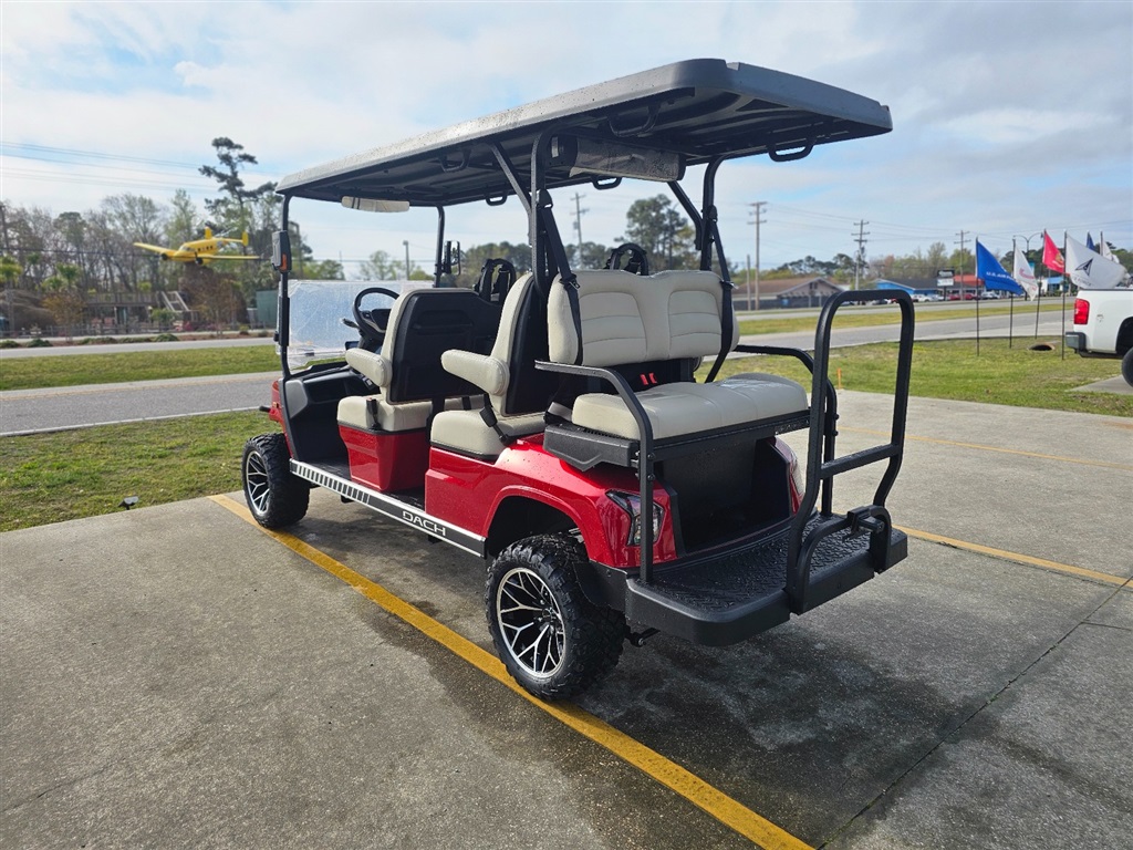BRAND NEW!!! Introducing the DACH Apollo 6 Passenger golf cart! Red on Beige Solar Chargering Roof! 73.6V Lithium battery est. 60+mile range / full charge! AC controller and AC 6 3kw motor Fast 25mph Independent front suspension 4 wheels Hydraulic disc brakes with EMB parking brake Steering Wheel Controls radio/cruise Cruise Control! First in the industry Self Canceling Turn Signals Entertainment Top w/ 2 lighted speakers and roof LED party lights Lighted rear Soundbar NFC + phone NFC + Phone Bluetooth with Start/Stop Button Dash top wireless phone charging! W/usb/usb C plugs. Mulit fuction steering wheel 12.3 inch touch screen display Apple CarPlay/Android Auto Running board / side steps and Much More!!!! WARANTY: Lifetime: Frame Lifetime: Battery 3 year: Motor / Controller 2 year: bumper to bumper $14,980.00!!! Must see!!! Test Drives Available Delivery Available